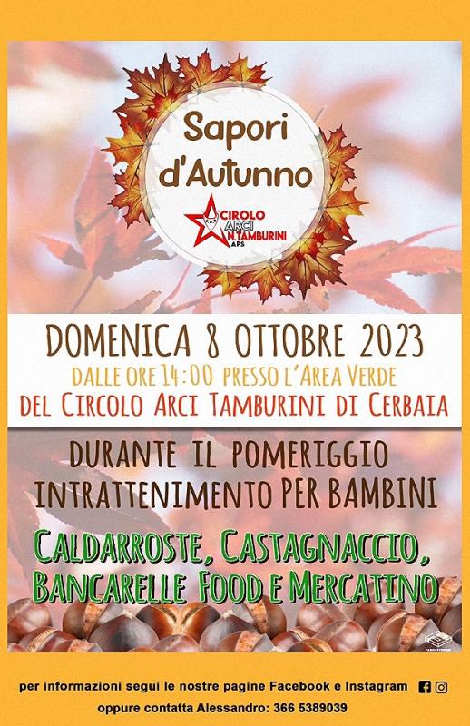 Domenica 08 Ottobre 2023 dalle ore 14.00 presso l'Area Verde circolo Tamburini Cerbaia a Cerbaia di Lamporecchio si terrà la manifestazione Sapori d'Autunno.