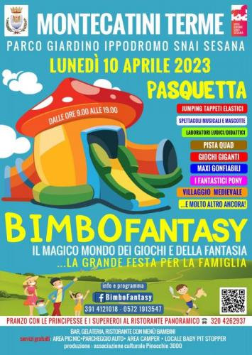 Per iniziativa dell'associazione culturale Pinocchio 3000 in collaborazione con Snaitech, è in programma la nuova edizione di BIMBOFANTASY - IL MAGICO MONDO DEI GIOCHI E DELLA FANTASIA che si terrà a MONTECATINI TERME, nel parco giardino dell'IPPODROMO SNAI SESANA, lunedì 10 aprile 2023, il giorno di pasquetta.