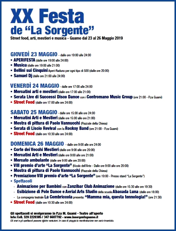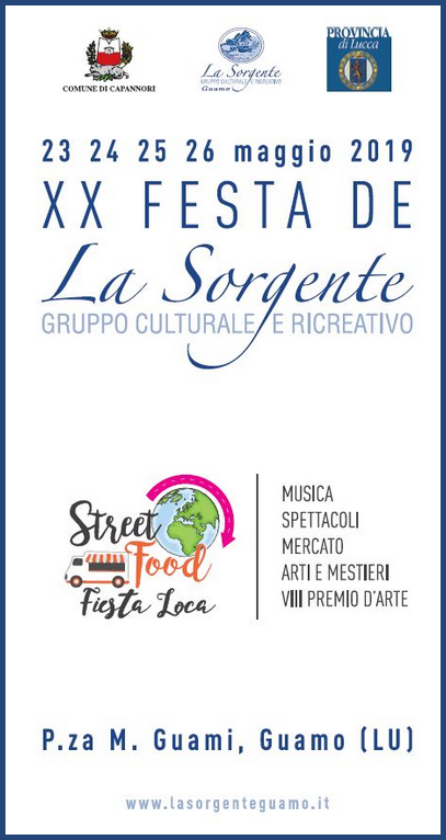 A Guamo, frazione del comune di Capannori in provincia di Lucca si svolge nei giorni 23, 24, 25, 26 Maggio 2019 la Festa de La Sorgente.