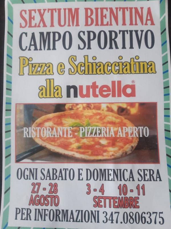 A Bientina in provincia di Pisa si svolgela Festa della Pizza. e schiacciatina alla Nutella ogni sabato e domenica sera nei giorni 27-28 Agosto 3-4 e 10-11 Settembre 2022
