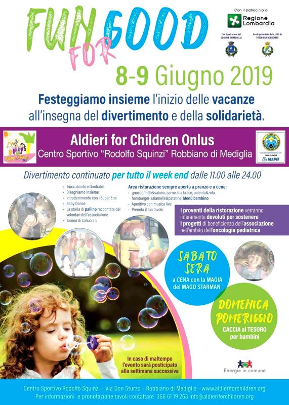 MEDIGLIA (MILANO), 29 maggio 2019 - Un weekend pieno di giochi, musica e sport per festeggiare la fine dell’anno scolastico e raccogliere fondi da destinare interamente all’associazione Aldieri for Children Onlus. “Fun For Good” - questo il nome dell’evento - in previsione per sabato 8 e domenica 9 giugno, si terrà al centro Rodolfo Squinzi di Robbiano di Mediglia, con il patrocinio dei Comuni di Mediglia e di Peschiera Borromeo e della Regione Lombardia. I due giorni di intrattenimento, con finalità benefiche, nascono dall’idea di creare un momento di festa e aggregazione per le famiglie.