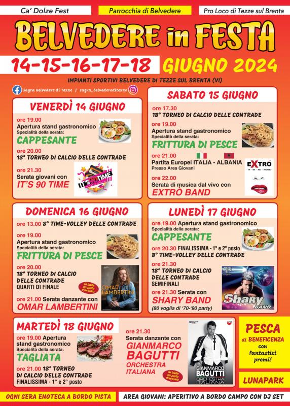 Festa a Belvedere di Tezze Sul Brenta in provincia di Vicenza si svolge nei giorni 14, 15, 16, 17, 18 Giugno 2024 la festa Ca' Dolze Fest.