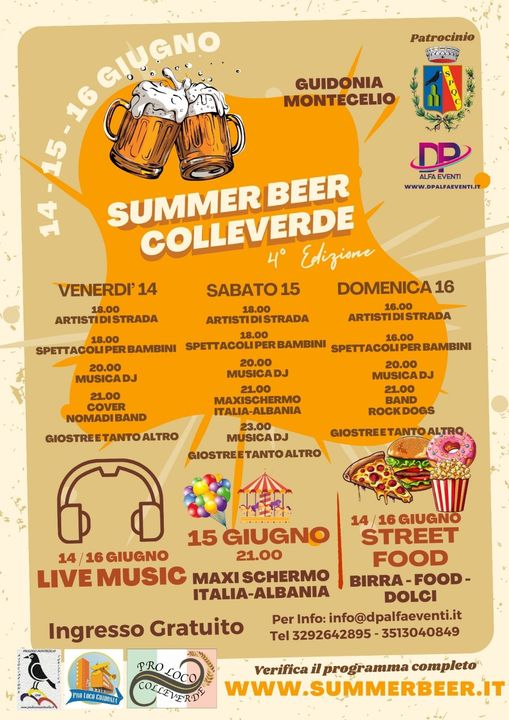 Il 14 – 15 – 16 Giugno a Colleverde (Guidonia) avrà luogo la quarta edizione del SUMMER BEER COLLEVERDE, un evento imperdibile dove si alternerà Live Music, Spettacoli, Animazione per bambini, Street food e Stand, inoltre verrà installato per il 15 Giugno un Maxischermo per la proiezione della partita di Euro 2024, Italia-Albania.
