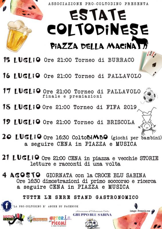 L’Associazione Pro-Coltodino organizza dal 15 al 21 luglio presso Piazza della Macina tanti appuntamenti pensati per tutte le età; di seguito il programma dettagliato: