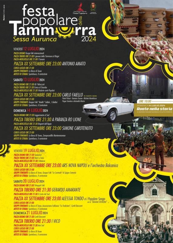 Il 12, 13, 14 e 19, 20, 21 Luglio 2024 a Sessa Aurunca (provincia di Caserta) si svolgerà la Festa Popolare della Tammorra, una manifestazione ormai consolidata e attesissima dagli appassionati e non del genere popolare.