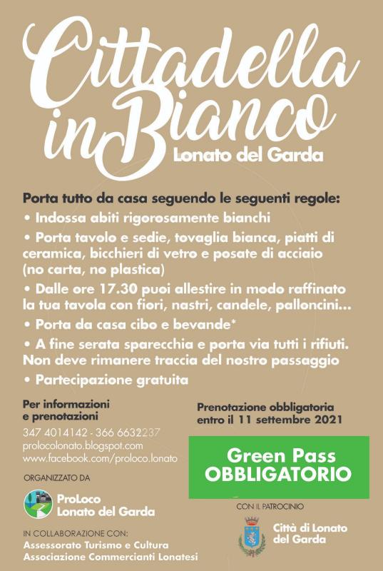 La Proloco di Lonato del Garda, con il patrocinio del Comune di Lonato e la collaborazione dell'Assessorato alla Cultura Turismo e dell'Associazione Commercianti Lonatesi, organizza per sabato 18 settembre 2021 dalle ore 20:00 alle ore 24:00 la manifestazione Cittadella in Bianco, un momento ludico-ricreativo durante il quale si intende allestire, nel suggestivo quartiere della Cittadella (zona ZTL), una cena estemporanea gratuita e aperta a tutti.