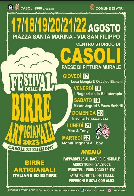 Il Festival delle Birre Artigianali a Casoli, ll Paese dei Murales, frazione del Comune di Atri (TE) si svolgerà dal 17 al 22 agosto 2023.