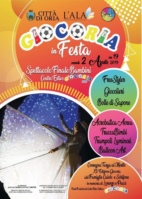 L’Amministrazione del Comune di Oria, in collaborazione con la Società Cooperativa L’Ala e la direzione artistica dell'associazione Smile di Manuel Manfuso, è lieta di invitare tutte le famiglie e i bambini alla XV edizione del “GiocOria in festa”. Tale evento è la chiusura del Campus estivo 2019, con una tradizione ormai quindicinale che rappresenta uno spazio dedicato ai padri fondatori del Centro Estivo Oritano, il Prof. Lorenzo Caiolo e il Prof. Pucci Schifone, che nella loro vita si sono spesi senza riserve per i bambini e i giovani di Oria.