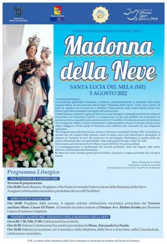 A Santa Lucia del Mela in provincia di Messina si svolgono nei giorni dal 27 Luglio al 05 Agosto 2022 i Solenni Festeggiamenti in Onore della Madonna della Neve.