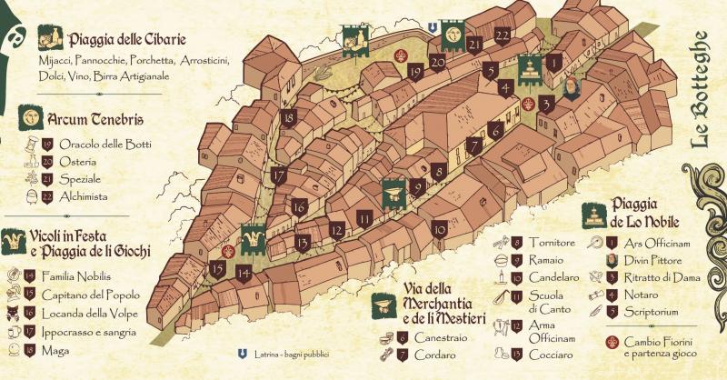 Dopo essere passati per la piaggia de le cibarie e aver mangiato lo storico “Mijiaccio” fritto, potrete andare a visitare l'Arcum Tenebris: un vicolo misterioso avvolto nell’oscurità e illuminato solo da candele. Qui potreste incontrare riti magici di fattucchiere, laboratori di alchimisti o potete visitare la grotta dell'Oracolo delle Botti per chiedergli il vostro destino.