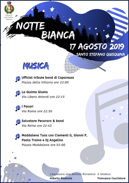 A Santo Stefano Quisquina in provincia di Agrigento si svolge nella giornata di Sabato 17 Agosto 2019 la festa della Notte Bianca.
