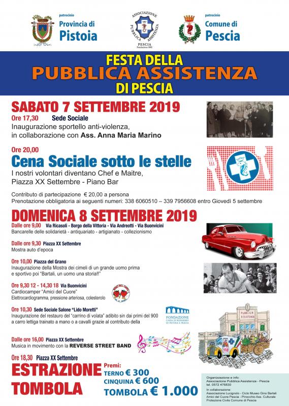 La seconda domenica di settembre, a Pescia, c'è la tradizionale festa organizzata dalla locale associazione di Pubblica Assistenza: è così da tantissimi anni, sempre con grande successo e partecipazione di pubblico. La Pubblica Assistenza è una tra le realtà associative del volontariato più attive sul territorio, in grado di garantire, quotidianamente, una serie di servizi assistenziali e sociali fondamentali per tutta la comunità ed in particolar modo per le persone più deboli e bisognose. Forte di una storia ultracentenaria, cerca sempre di rinnovarsi per essere al passo dei tempi, con personale volontario formato e qualificato in grado di rispondere a tutte le esigenze della popolazione ed in grado di intervenire per emergenze più complesse.