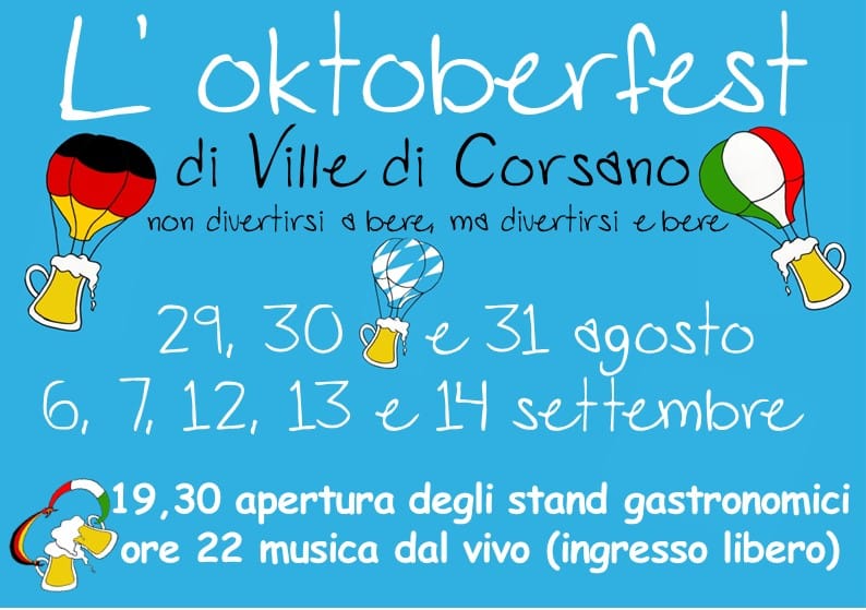 La 21a edizione dell'Oktoberfest a Ville di Corsano si svolge nei giorni 29, 30, 31 Agosto e 06, 07, 12, 13, 14 Settembre 2019.