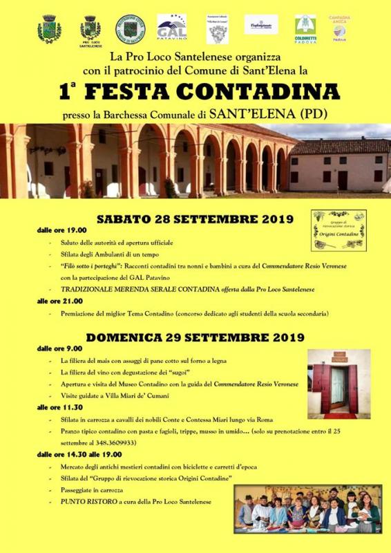 La Pro Loco Santelenese con il patrocinio del Comune di Sant'Elena della provincia di Padova organizza nei giorni 28 e 29 Settembre 2019 la 1a edizione della Festa Contadina.