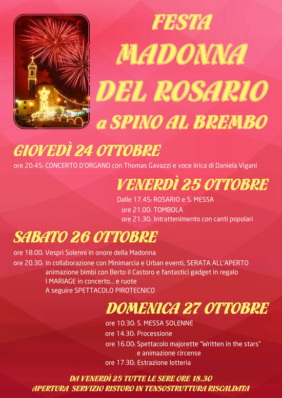 A Spino al Brembo, frazione del Comune di Zogno in provincia di Bergamo si svolge nei giorni 24, 25, 26, 27 Ottobre 2019 la Festa della Madonna del Rosario.