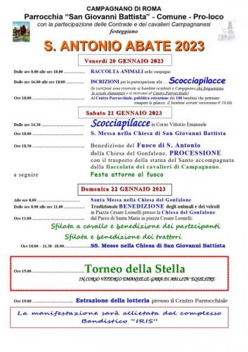 Proprio in suo onore è dedicato il prossimo fine settimana, caratterizzato dall'accensione del fuoco, la solenne Processione, la fiaccolata a cavallo, "le scocciapilacce", le Benedizioni, la sfilata dei trattori e mezzi agricoli e la IV edizione del TORNEO DELLA STELLA DI CAMPAGNANO DI ROMA.
