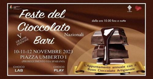 A grande richiesta, con il patrocinio del Comune di Bari, torna la V edizione della Festa del Cioccolato, da Venerdì 10 a Domenica 12 Novembre 2023, in Piazza Umberto I.
