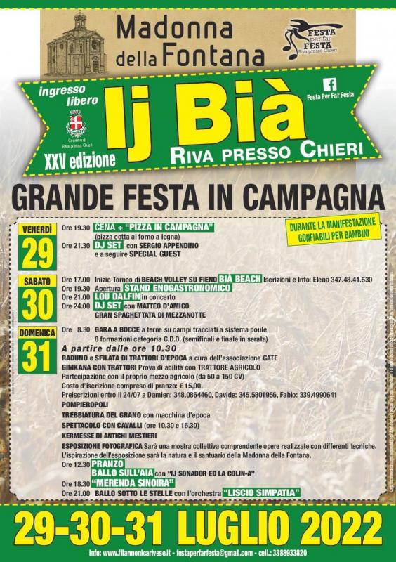 L'Amministrazione Comunale, l'Associazione Festa per Far Festa e la Filarmonica Rivese invitano tutti i cittadini alla festa della trebbiatura "Ij Bià - Antichi Mestieri" che si terrà a Riva presso Chieri località Madonna della Fontana il 29-30-31 Luglio 2022