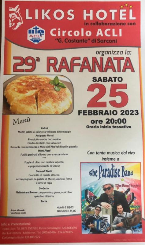 A Sarconi in provincia di Potenza si svolge nella giornata di Sabato 25febbraio 2023 la 29a edizione della Festa della Rafanata.