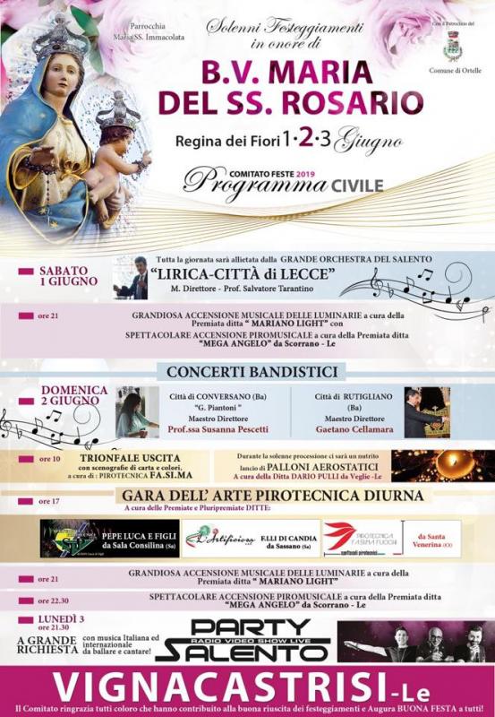 A Vignacastrisi, frazione del Comune di Ortelle in provincia di Lecce si svolgono nei giorni 01, 02, 03 Guigno 2019 i solenni festeggiamenti in onore di B. V. Maria del SS Rosario, Regina dei Fiori, Patrona della Città.