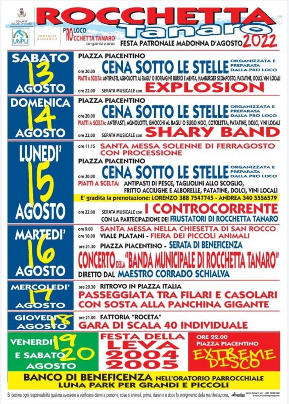 Da sabato 13 a sabato 20 agosto 2022, a Rocchetta Tanaro, è in programma la festa patronale Madonna d'Agosto 2022.