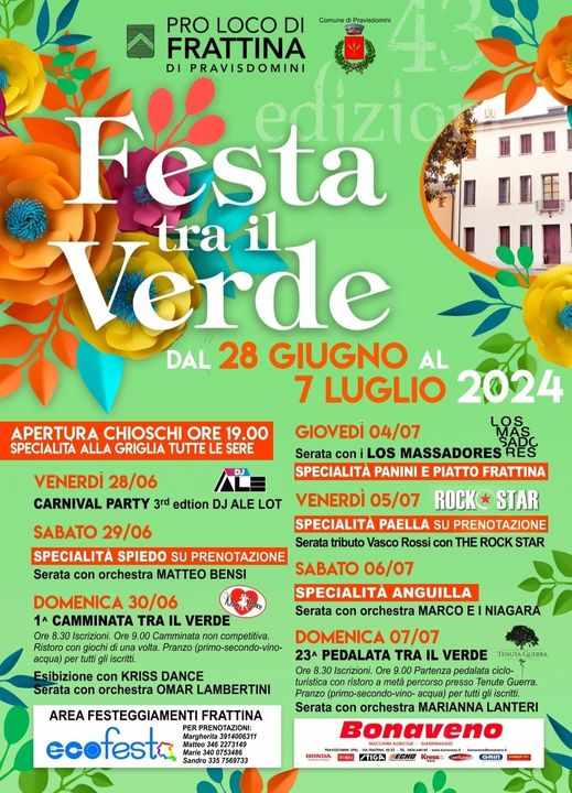 Festa Tra il Verde a Frattina di Pravisdomini dal 28 al 30 giugno e dal 4 al 7 Luglio 2024 all'area festeggiamenti di frattina.