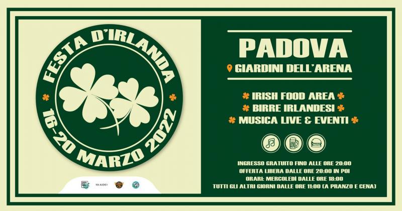 Dopo il rinvio del 2020 e 2021 finalmente nella primavera del 2022 i Giardini dell'Arena di Padova si riaccendono di verde con la Festa D’Irlanda: da Mercoledì 16 a Domenica 20 Marzo in scena cinque giornate da non perdere: tra Birre tradizionali irlandesi, Musica dal vivo ed eventi, Irish food Area con specialità dolci e salate...
