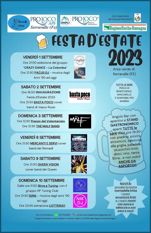 A Serravalle, frazione del Comune di Riva del Po in provincia di Ferrara si svolge nei giorni 01/02/03 - 08/09/10 Settembre 2023 la Festa d'Estate.