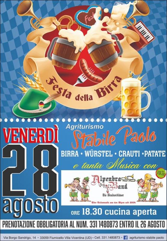 Presso l'Agriturismo Stabile Paolo a Fiumicello Villa Vicentina in provincia di Udine si svolge nella giornata di Venerdì 28 Agosto 2020 la Festa della Birra.