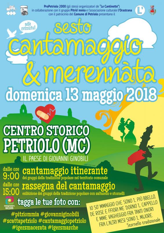 Il Cantamaggio, assieme alla Pasquella, la Passió’ e lo Scacciamarzo, è uno dei più noti canti rituali di questua della tradizione della nostra Marca centrale. Questi canti propiziatori vengono eseguiti sin da tempi immemori da musici e cantori popolari, che in cambio di una mangiata e una bevuta portavano e portano ancora, casa per casa, auguri di benessere per la comunità ed i singoli, seguendo un cerimoniale ben preciso.