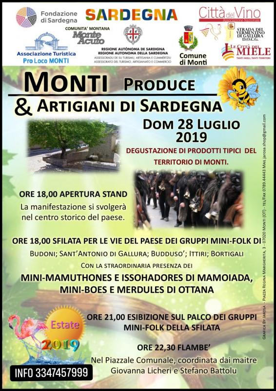 Anche quest’anno rinnoviamo l’appuntamento dell’ultima Domenica di Luglio (28 Luglio 2019) con “Monti Produce e Artigiani di Sardegna”. Saranno presenti sette gruppi Mini-Folk di Budoni, Sant’Antonio di Gallura, Buddusò, Ittiri e Bortigali, con la straordinaria partecipazione dei MINI MAMUTHONES E ISSOHADORES DI MAMOIADA e i MINI BOES E MERDULES DI OTTANA.