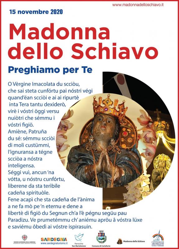 La Festa della Madonna dello Schiavo a Carloforte, preceduta da una solenne novena, ricorre ogni anno il 15 Novembre. I festeggiamenti, di stretto carattere religioso, culminano la sera del giorno 15 con una solenne processione. L’incoronazione del simulacro, avvenne il 15 novembre 1964.