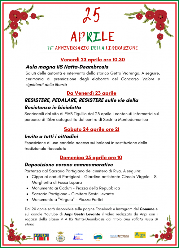 In occasione del 76° anniversario della Liberazione, Comune di Sestri Levante, ANPI e l’istituto di istruzione superiore Natta-Deambrosis presentano il tradizionale calendario di appuntamenti per celebrare la giornata del 25 aprile.