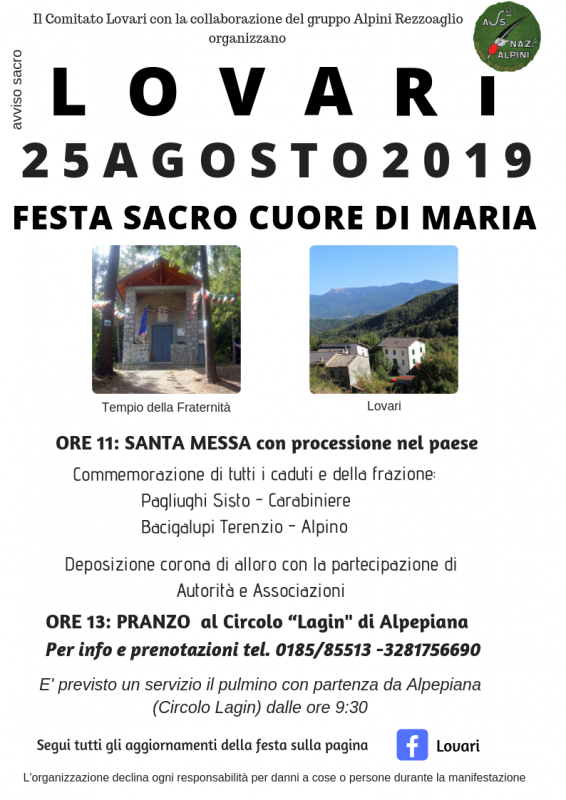 Domenica 25 Agosto nella piccola frazione di Lovari, nel Comune di Rezzoaglio (GE) si celebra la Festa del Sacro Cuore di Maria