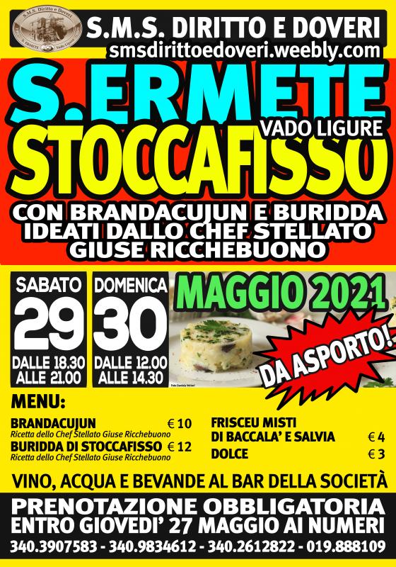 Sabato 29 dalle 18.30 alle 21.00 e Domenica 30 Maggio dalle 12.00 alle 14.30 un appuntamento da non perdere per tutti gli appassionati di cucina gourmet. Lo chef stellato Giuse Ricchebuono regala la sua esperienza alla SMS del suo paese di origine, Sant’Ermete, istruendo la brigata della cucina con le ricette di due grandi classici della cucina ligure: il Brandacujun e la Buridda di Stoccafisso. Come già con il Cappon Magro lo chef supervisionerà la preparazione e non abbiamo dubbi che sarà un successo. E’ ancora presto per una vera e propria sagra e quindi sarà possibile solo l’asporto previa prenotazione ai numeri che trovate in fondo all’articolo.