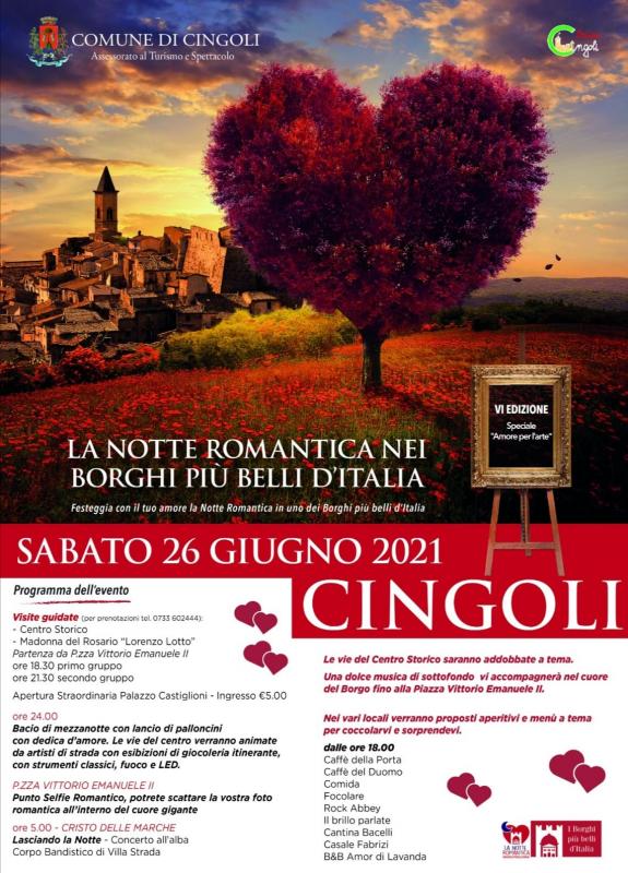 Ne "La Notte Romantica nei Borghi più belli d'Italia", Cingoli si vestirà del colore dell'amore per regalarvi un'esperienza indimenticabile. Una dolce musica di sottofondo vi accompagnerà nel cuore del borgo fino alla piazza, dove un cuore, grande grande farà da cornice alle vostre foto per suggellare questo dolce momento.