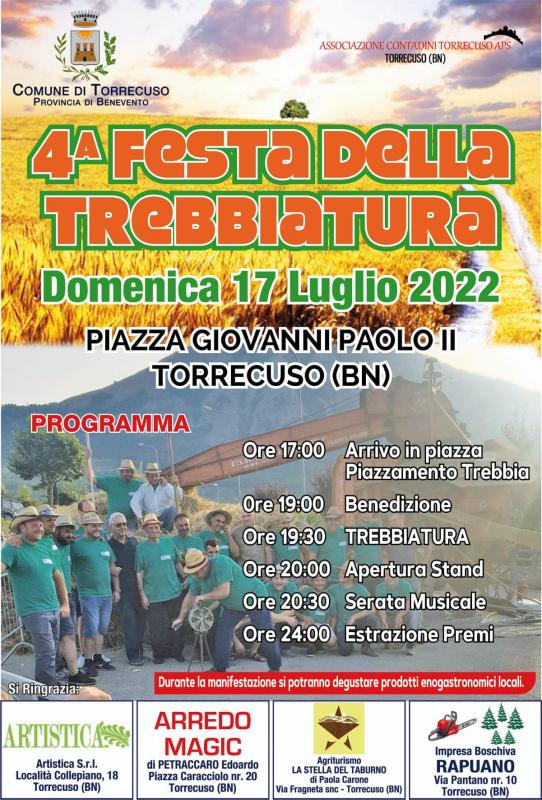 A Torrecuso in provincia di Benevento si svolge nella giornata di Domenica17 Luglio 2022 la 4a edizione della Festa della Trebbiatura.
