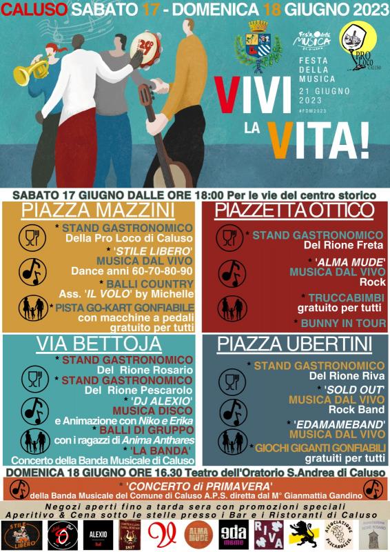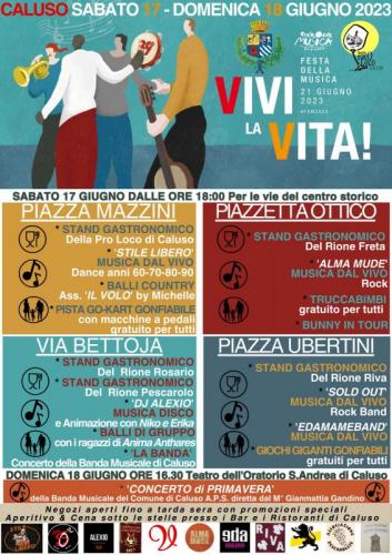 l prossimo 17-18 giugno 2023, 29ma edizione della Festa della Musica a Caluso, con il tema "VIVI LA VITA", sarà dedicato, oltre alla particolare attenzione per l'ambiente, alla sicurezza del dopo concerto, con importanti iniziative sul ruolo culturale e sociale della musica attraverso concerti, performance ed eventi.