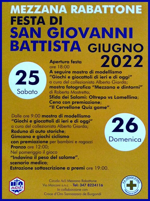 A Mezzana Rabattone in provincia di Pavia si svolge nei giorni Sabato 25 e Domenica 26 Giugno 2022 la Festa di San Giovanni Battista.