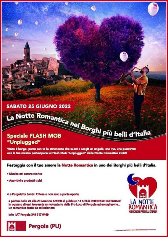 Oltre al FLASH MOB "UNPLUGGED" che caratterizzerà l'edizione 2022 in tutti i Borghi, il programma della serata sarà arricchito dall'iniziativa promossa dalla Pro Loco Pergola "Chiese (e non solo) a porte aperte" grazie alla quale 14 siti di interesse culturale saranno visitabili.