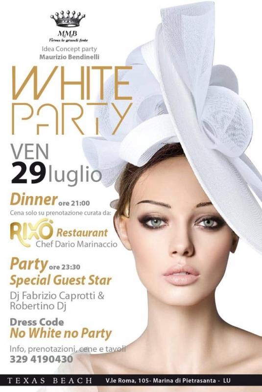 Venerdì 29 luglio dalle 21 al bagno Texas di Marina di Pietrasanta andrà in scena la 23° edizione del WHITE PARTY ANNIVERSARY, il tradizionale appuntamento 'in bianco' della Versilia a due passi dalla spiaggia, che recupera così il mood di eleganza delle più celebri notti in stile tropezienne.