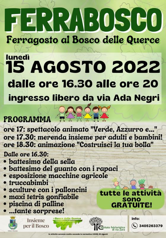 Il Comitato folcloristico di via Zara in collaborazione con l’amministrazione comunale vuole proporre alla cittadinanza un momento allegro e spensierato all’insegna del divertimento e della convivialità, per adulti e bambini, all’interno del Bosco delle Querce (area dello chalet) il giorno lunedì 15 agosto 2022 a partire dalle ore 16.30.