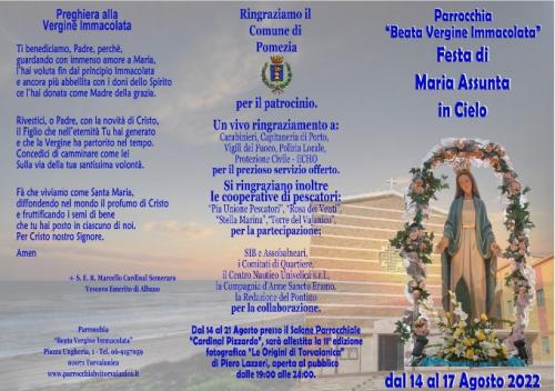 Si svolgerà a Torvaianica, dal 14 al 17 agosto, la tradizionale festa di Maria Assunta in Cielo, a cura della parrocchia Beata Vergine Immacolata, e con il patrocinio del Comune di Pomezia, che riproporrà – lunedì 15 agosto – la storica processione a mare, con l’immagine della Madonna accompagnata dalle barche dei pescatori della città.