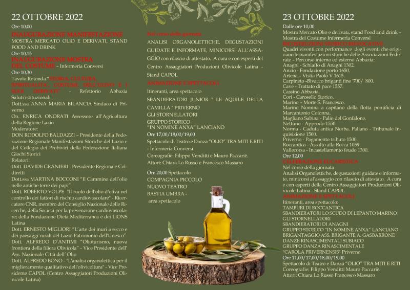 L’inaugurazione avrà luogo sabato 22 mattina alle ore 10,00 con la “Mostra mercato olio e derivati”, stand food and drink, a seguire la “Mostra sui Costumi Storici” delle diverse città Rievocative del Lazio, presso l’Infermeria dei Conversi e ancora, la tavola rotonda tenuta da relatori di noto spessore, “storia, cultura, spiritualità, costumi, dell’ulivo e i suoi derivati” presso gli spazi del Refettorio dell’Abbazia di Fossanova.