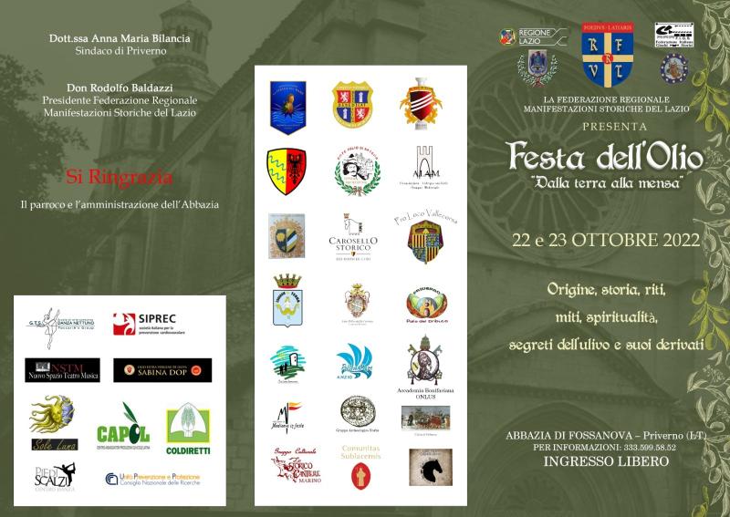 Sabato 22 e domenica 23 ottobre, il Borgo di Fossanova, l’Abbazia e i suoi luoghi, saranno ancora una volta protagonisti di una delle più suggestive manifestazioni dell’autunno laziale: “Dalla terra alla mensa”, la Festa dell’olio organizzata dalla Federazione Regionale Manifestazioni Storiche del Lazio la cui Presidenza è affidata a Don Rodolfo Baldazzi, realizzata con il contributo della Regione Lazio e il patrocinio del Comune di Priverno.