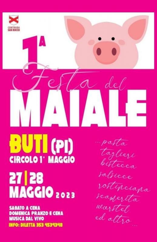 Presso il Circolo 1° Maggio a Buti in provincia di Pisa si svolge nei giorni 27 e 28 Maggio 2023 la 1a Edizione della Festa del Maiale.