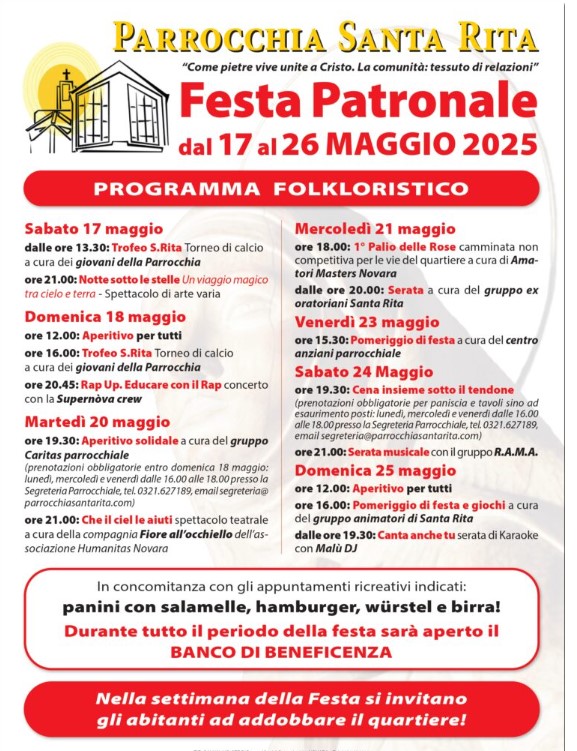 Venerdì 23 maggio appuntamento con la tradizionale processione per le vie del quartiere (Chiesa – Via B. Stangalino – Via S. Rita – via Alagna Valsesia – via Roggia Ceresa – via Maggi – via Biandrate – via Valsesia – via Visintin – Via B. Stangalino – Chiesa) accompagnata dalla Banda Musicale Margherita di Cameri.