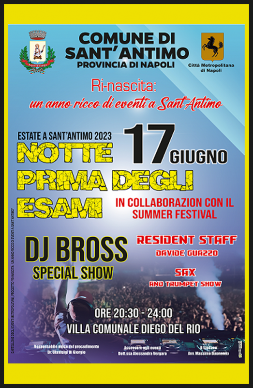 Presso la Villa Comunale Diego del Rio a Sant'Antimo in provincia di Napoli si svolge nella giornata di Sabato 17 Giugno 2023, dalle ore 20.30 alle ore 24.00, la festa Notte Prima degli Esami - Estate a Sant'Antimo 2023 in collaborazione con il Summer Festival.