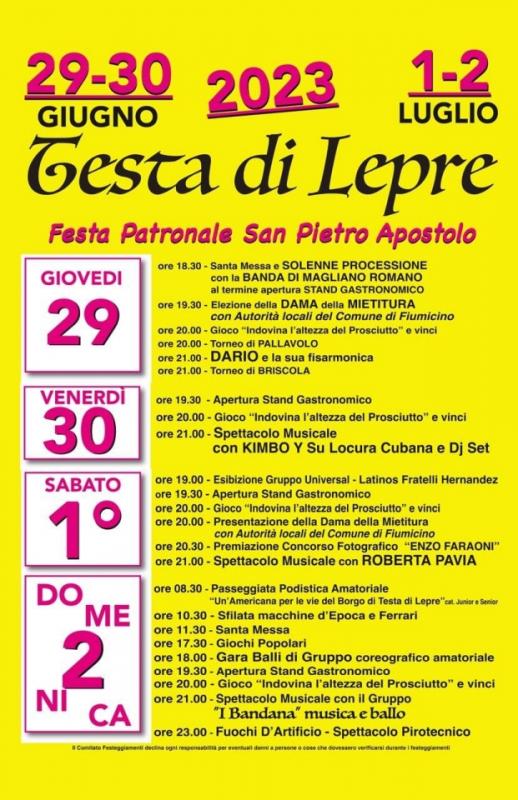 A Testa di Lepre, frazione del Comune di Fiumicino in provincia di Roma si svolge nei giorni dal 29 Giugno al 02 Luglio 2023 la Festa Patronale di San Pietro Apostolo.