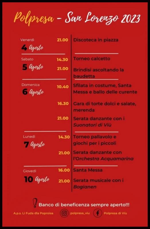 A Polpresa, frazione del Comune di Viù in provincia di Torino si svolge nei giorni dal 04 al 10 Agosto 2023 la Festa di San Lorenzo.